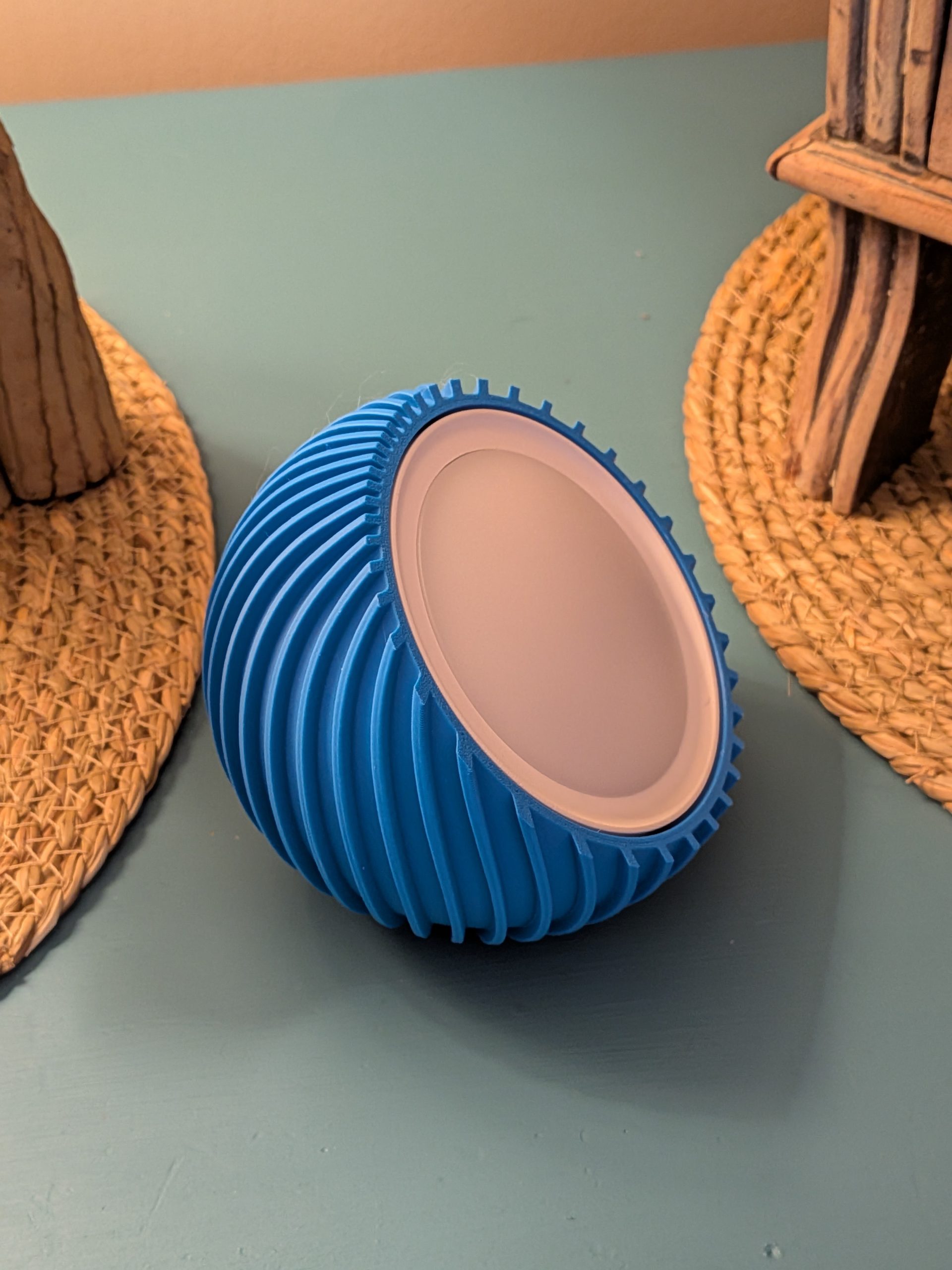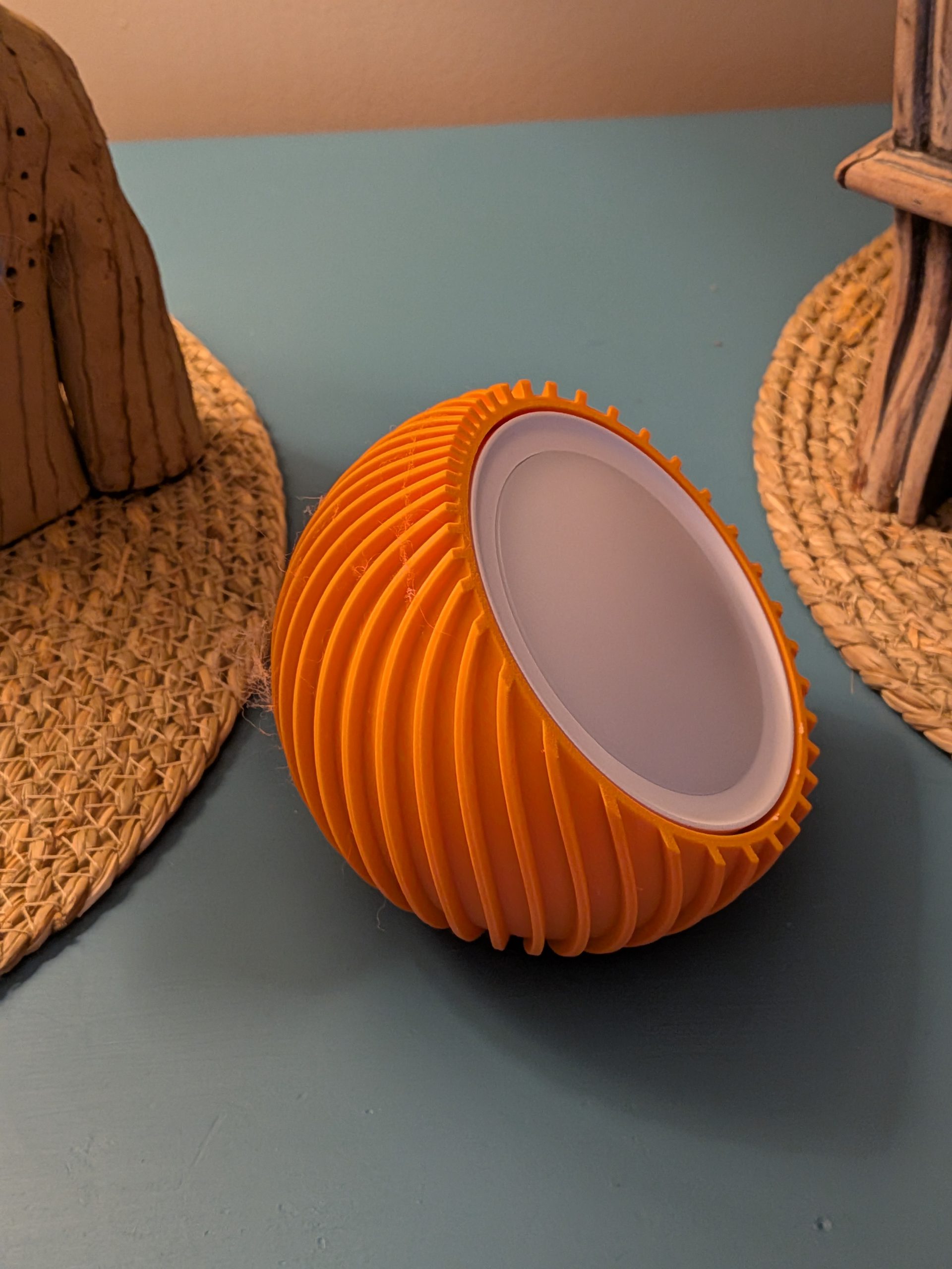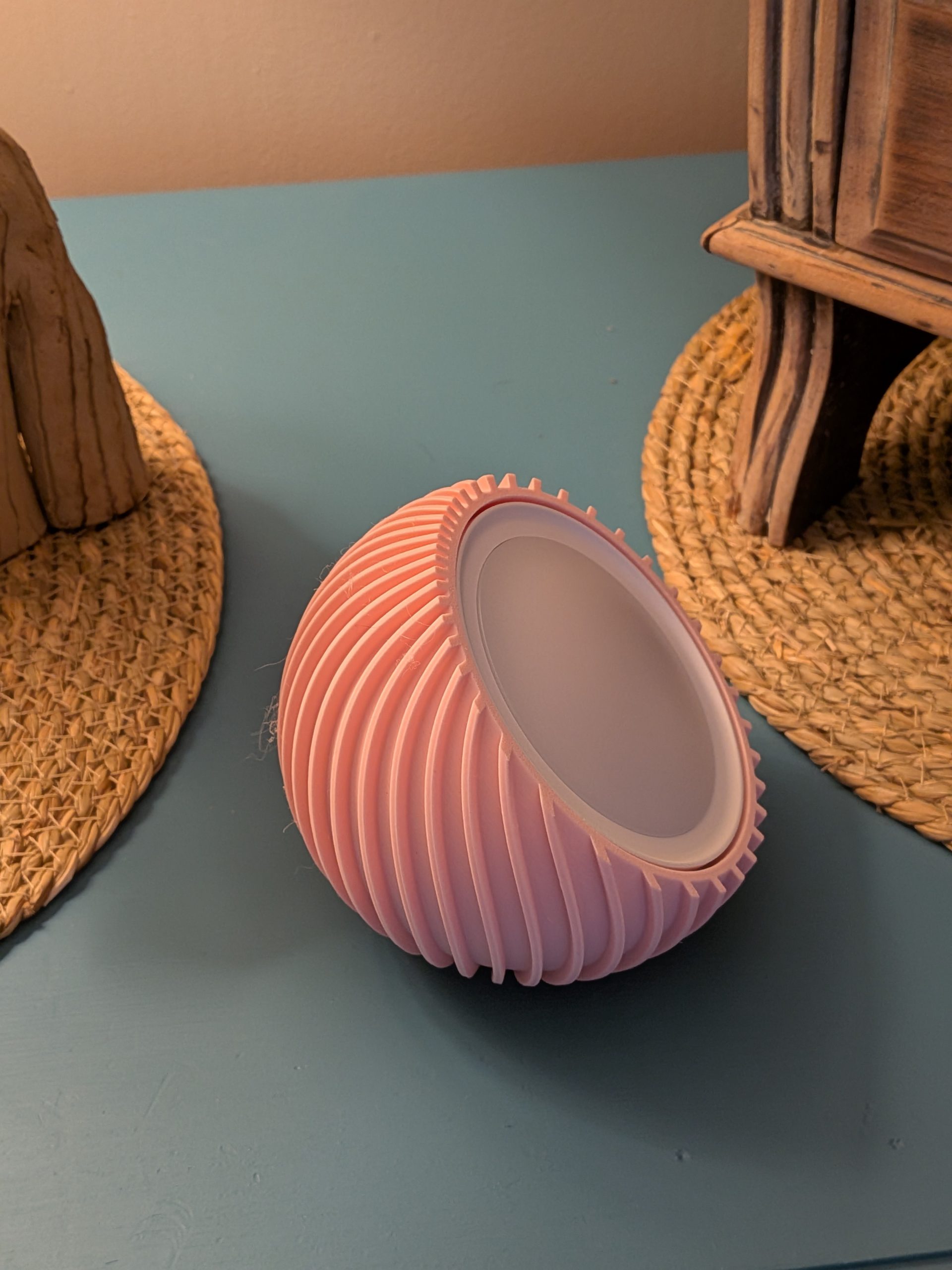 I designed this spherical rechargeable light after seeing a similar mains powered light advertised online. The whole point of this light is that it’s very portable. Something you can just pick up, place anywhere, and instantly create a calm, atmospheric corner in your home. It banishes darkness exactly where you need it to. Tethering it with cables and having to find sockets defeats the object in my opinion.