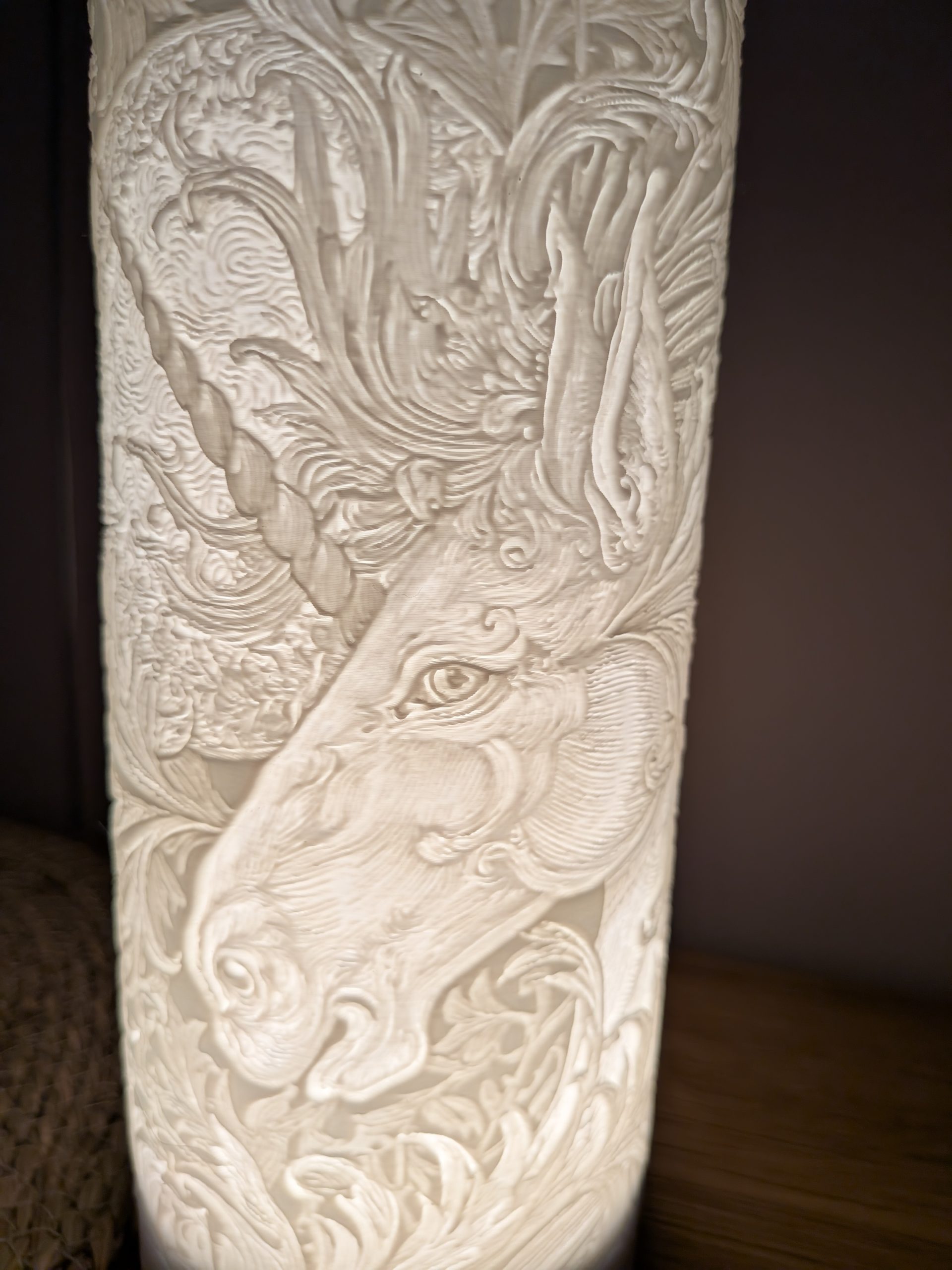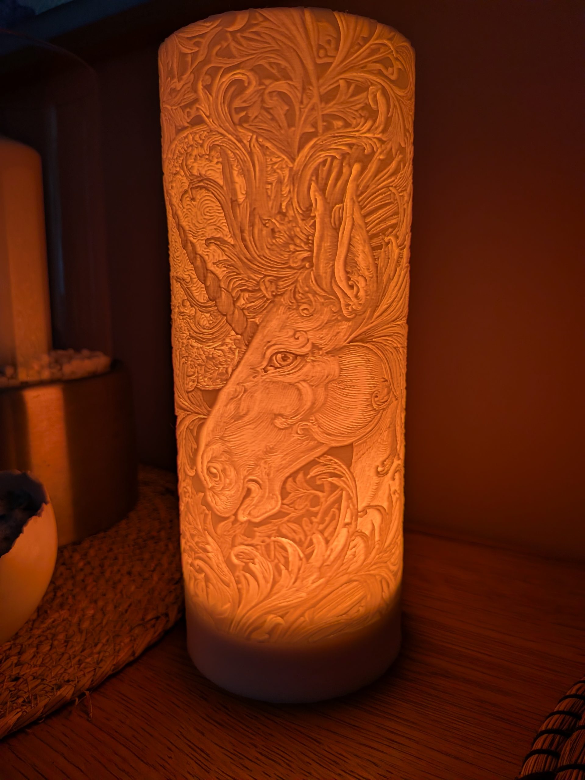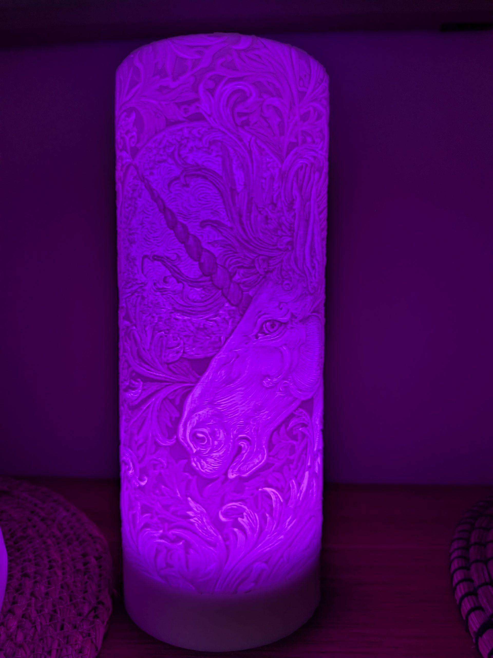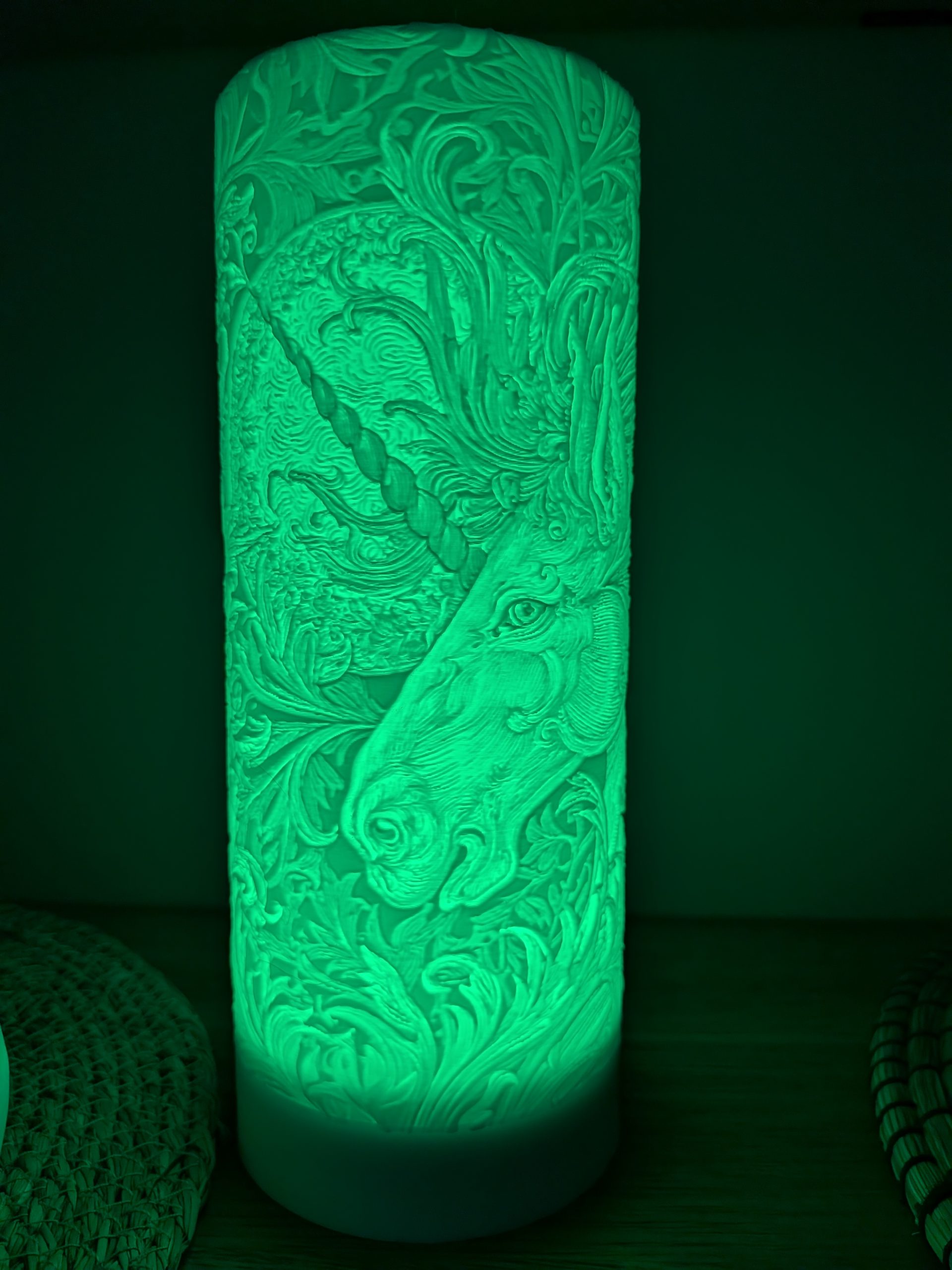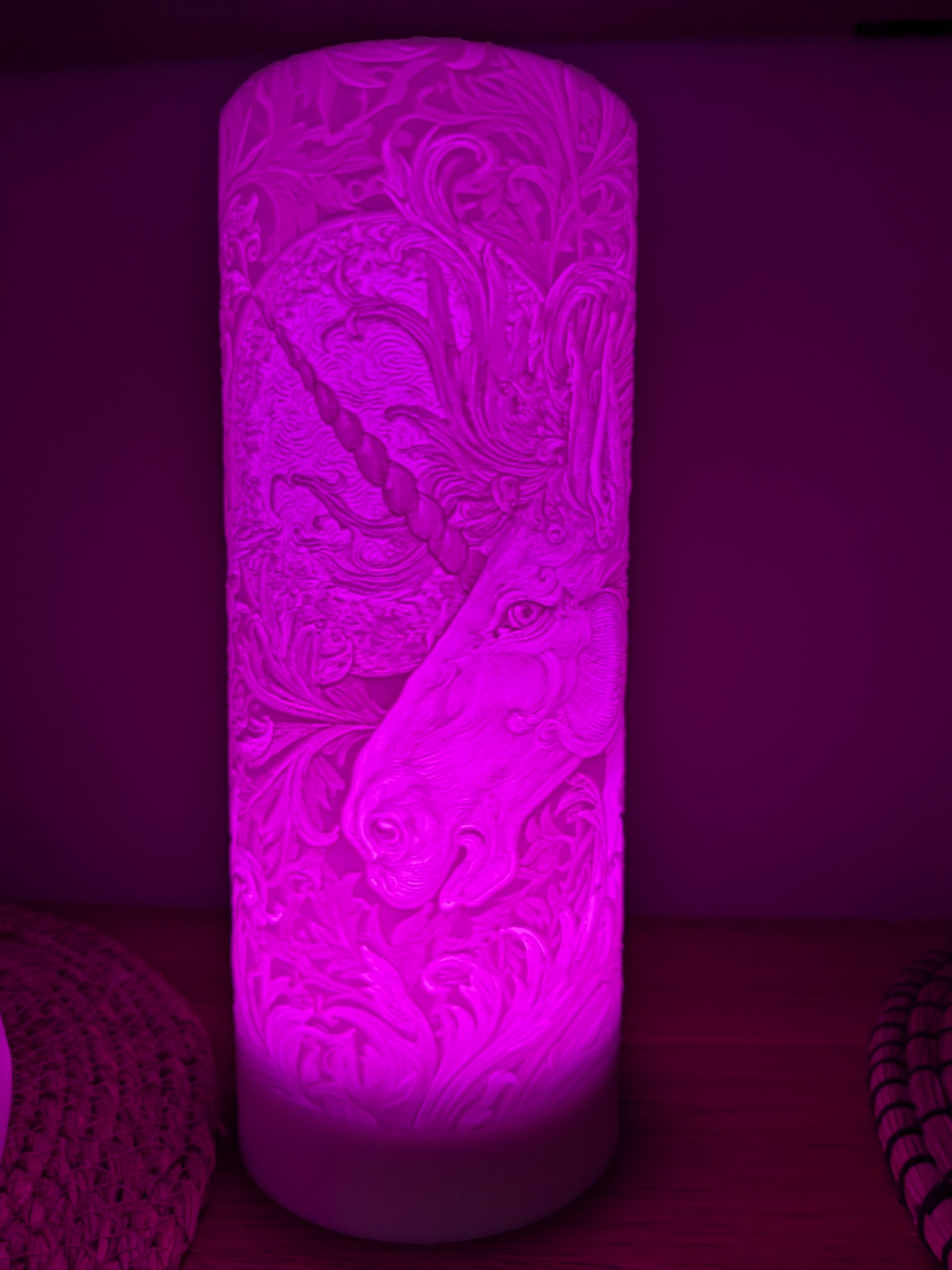 This unicorn night light stands 200mm tall and 100mm in diameter – substantial enough to feel like a statement piece, but compact enough to sit comfortably on a bedside table, bookshelf or sideboard. When it’s lit, the detailed 3D printed design comes to life. The moon glows softly behind the unicorn’s profile, and the swirling foliage creates depth and texture that you can see and feel.One of the things I cared about most when creating this unicorn nightlight was freedom. It’s fully rechargeable and lasts up to 24 hours between charges, depending on the colour you choose using the included remote control. That means no trailing cables, no hunting for sockets, no being limited to one corner of the room. You can place it wherever it feels right – on your bedside table one night, on a hallway console the next, maybe even as a centrepiece when you want a bit of quiet magic in the evening. And if you feel like moving it, you simply pick it up and take it with you.